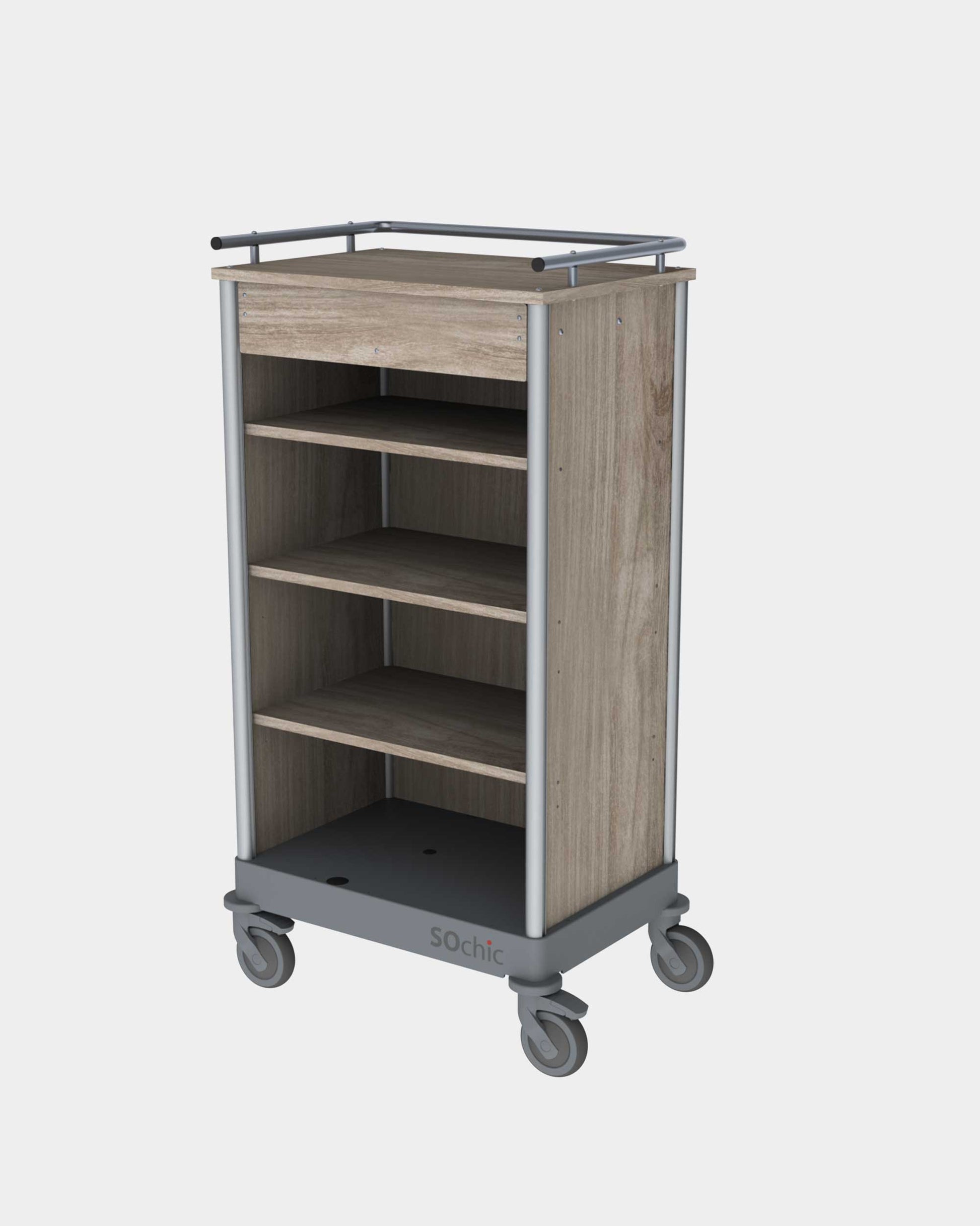 With a choice of two charming color variations: wood effect and texture effect, the SOchic 2.1 combines style and efficiency, offering a complete solution for improving the organization and presentation of objects in various situations. Thanks to its height and reliable performance, it is an ideal choice for those looking for a complete and functional hospitality trolley, optimized for tighter spaces.