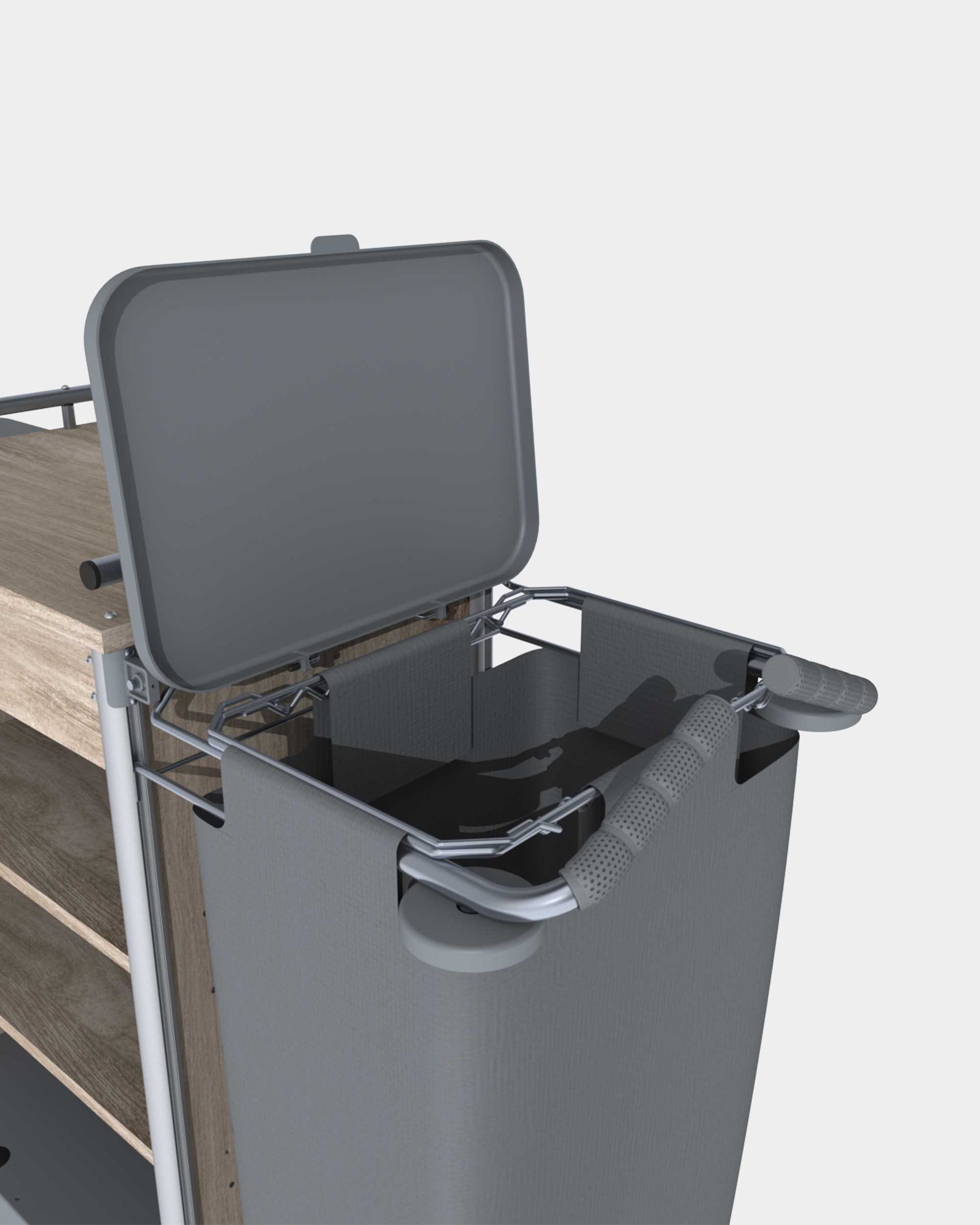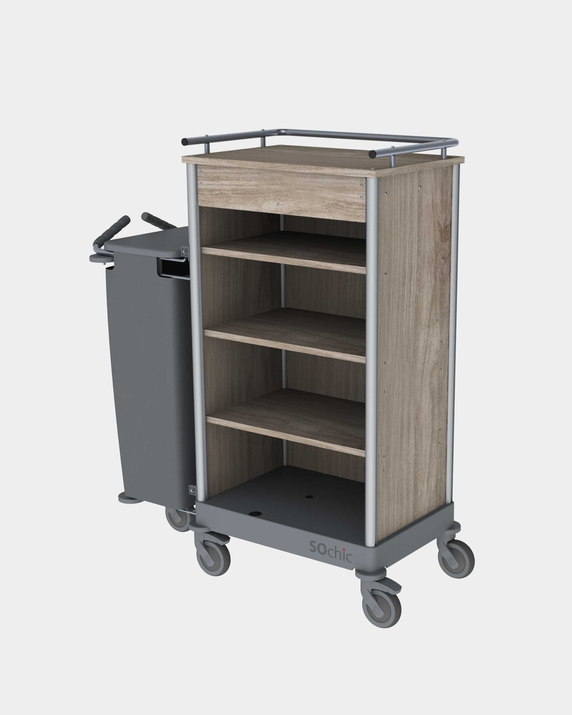 The SOchic 2.1 Mono is the tallest and narrowest model in the SOchic line, characterized by a "medium" base, high upright, a front drawer and a side bag holder. This trolley offers a complete, compact and quality solution, ideal for meeting storage needs in the hospitality sector.
