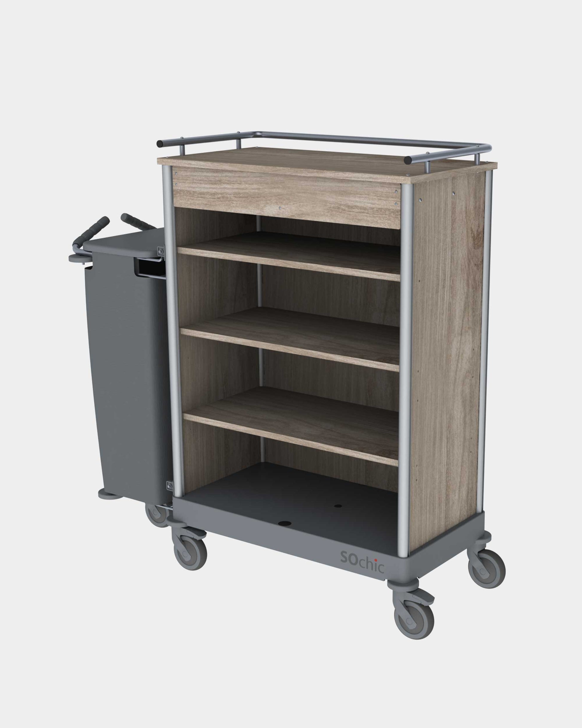With a choice of two charming color variations: wood effect and texture effect, the SOchic 2 Mono combines style and efficiency, offering a complete solution for improving the organization and presentation of objects in various situations. Thanks to its generous capacity and reliable performance, it represents an ideal choice for those looking for a complete and functional hospitality trolley.