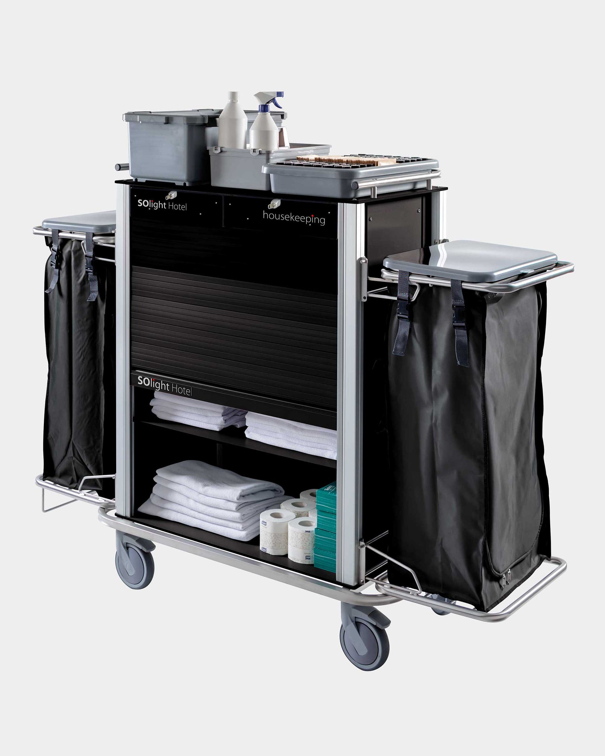 SOlight 2 Loop Pro can be completely closed to hide its contents from view. Equipped with a roller shutter and two front drawers.